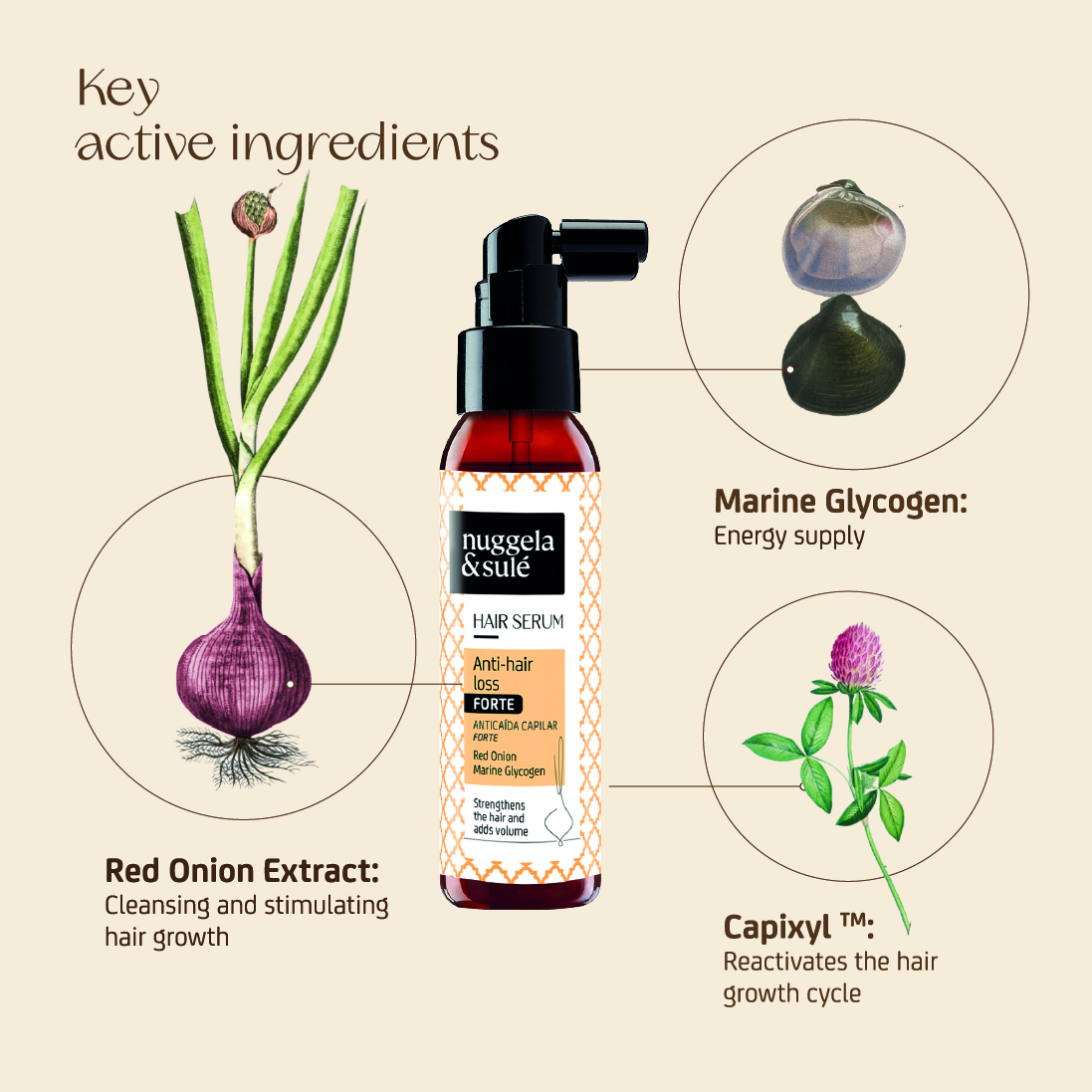 With Capixyl™, Red Onion Extract and Marine Glycogen, active ingredients that help reduce hair loss, strengthen, and stimulate hair growth.