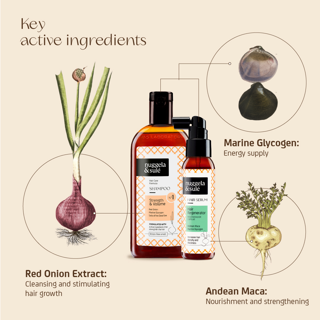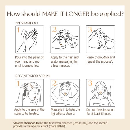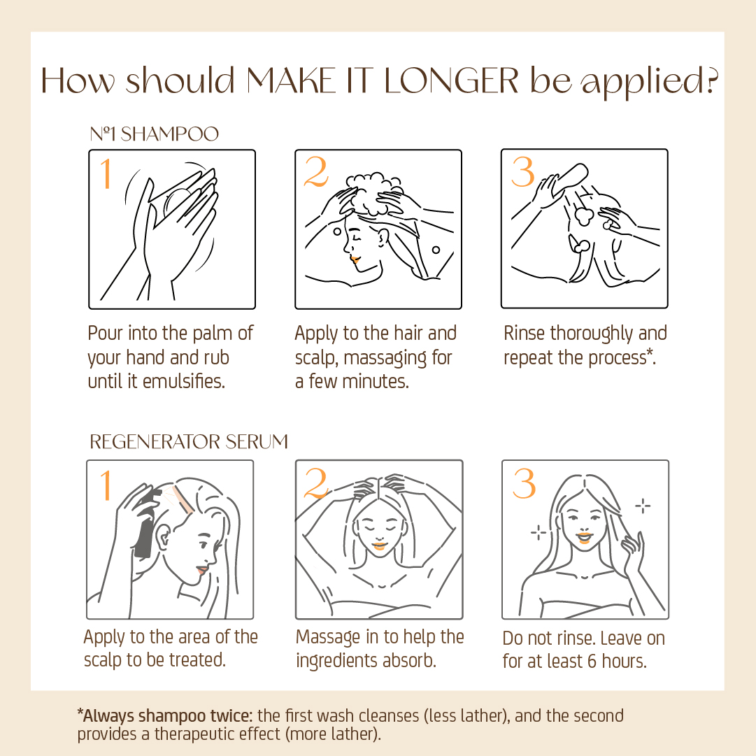 Our five-time award-winning hair treatment includes: 1 unit of Nº1 Shampoo ‘Strength & Volume’ 250 ml and 1 unit of Hair Regenerating Serum 70 ml