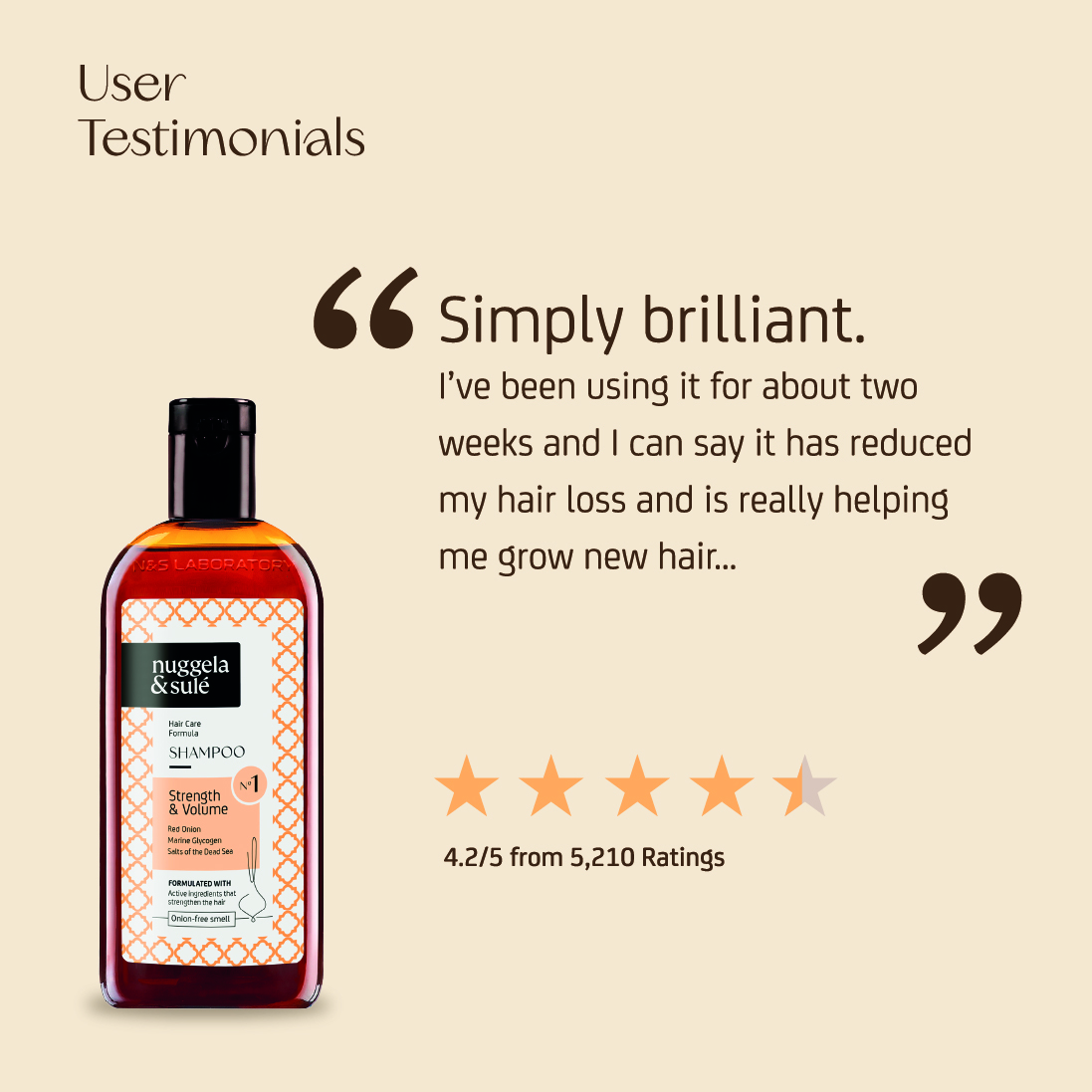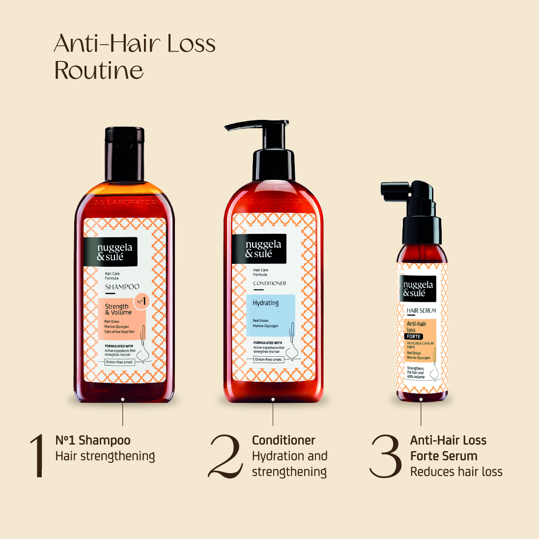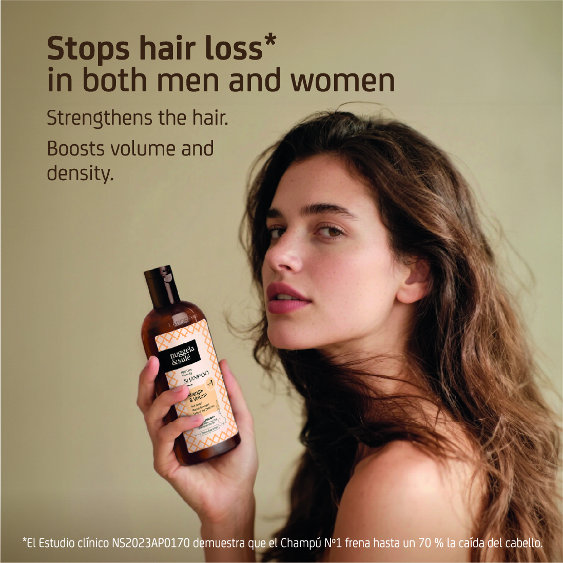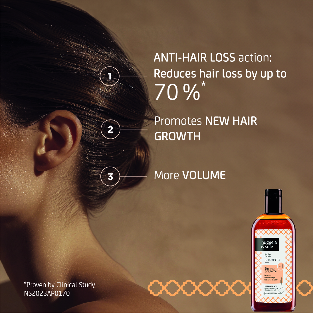 The Nº1 Shampoo ‘Strength & Volume’ for men and women with Red Onion Extract is a daily-use shampoo that strengthens the hair, stimulates its growth from the root, and reduces hair loss (proven by Clinical Study)*.