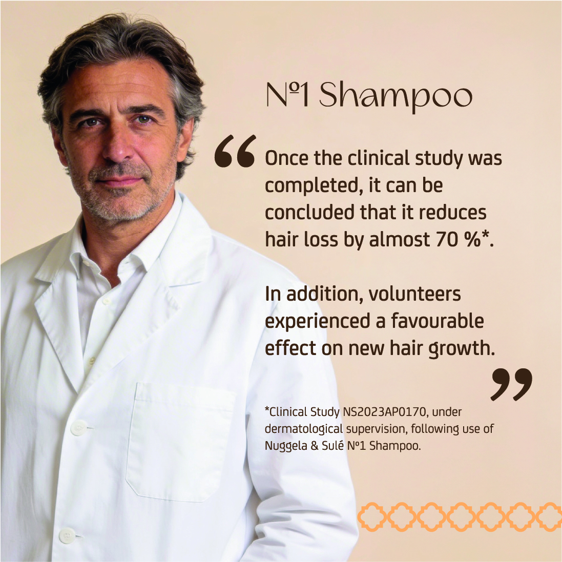In a study to assess the cosmetic effectiveness of the anti-hair loss effect of Shampoo Nº1 by Nuggela & Sulé, and after 60 days of application, with a washing frequency of at least three (3) times per week in volunteers, the results showed a decrease of up to 42% in hairs shed in the anagen phase and an increase of 69.9% in hairs shed in the telogen phase. Therefore, given the significance of the statistical analyses, the following claims can be made: