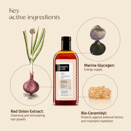 With Red Onion Extract, Bio-Ceramidyl, Dead Sea Salts, and Marine Glycogen, active ingredients that soothe and regenerate the scalp.