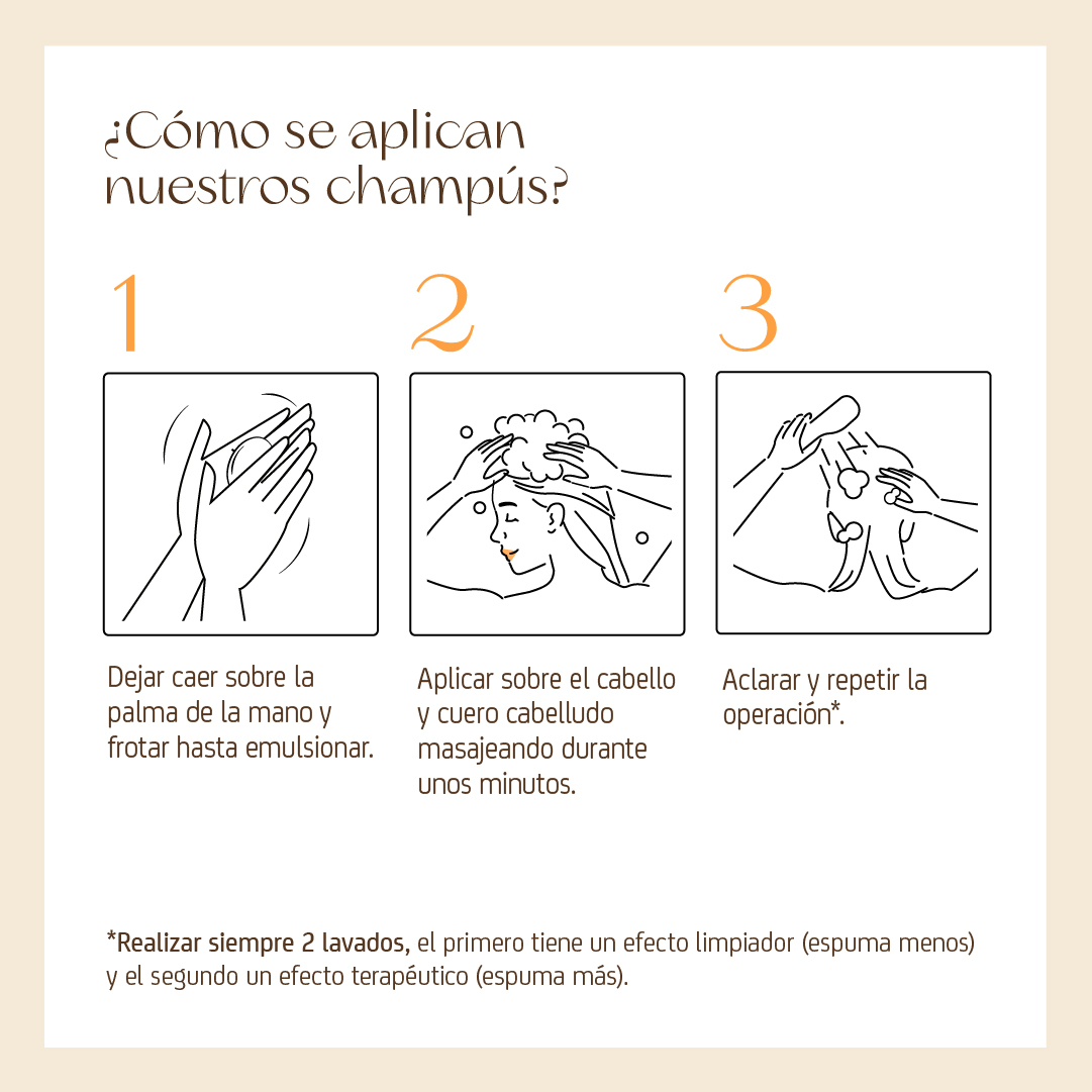 HACIÉNDOLO DE ESTA MANERA: se preparan los activos en la palma de la mano. Se distribuye de manera uniforme los ingredientes activos por el cabello y cuero cabelludo. Se genera más espuma, facilitando el masaje capilar.