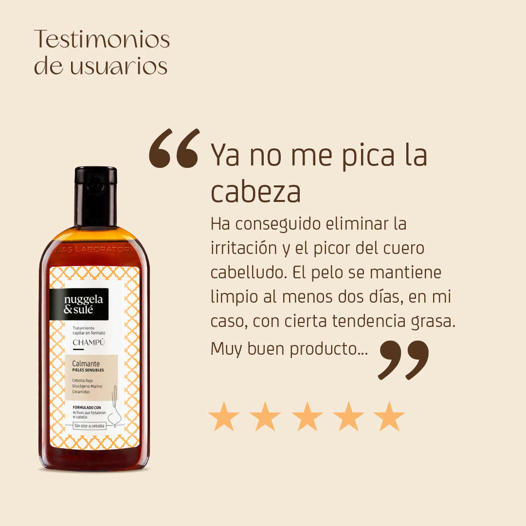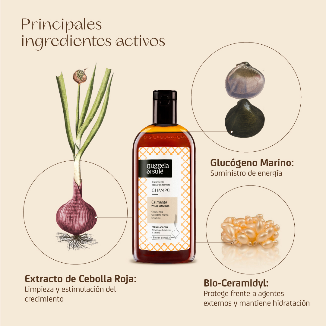 Con Extracto de Cebolla Roja, Bio-Ceramidyl y Glucógeno Marino, ingredientes activos que calman y regeneran el cuero cabelludo.