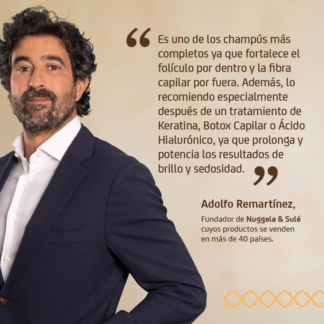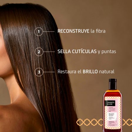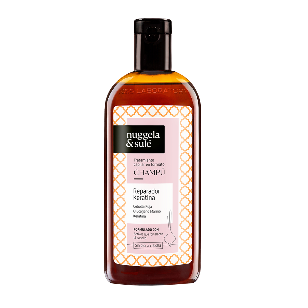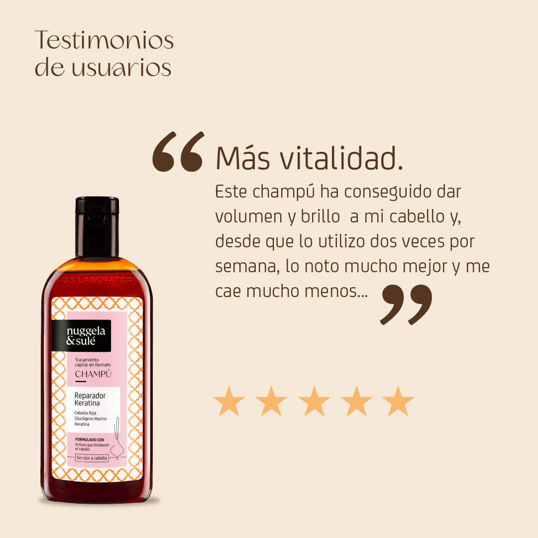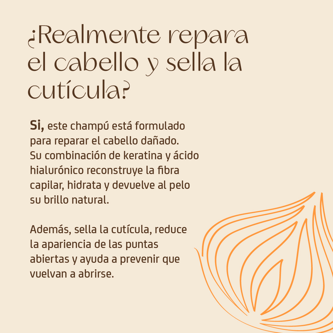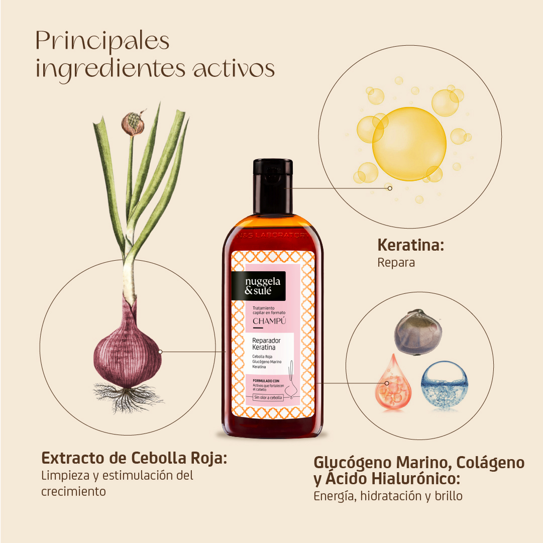 Con Extracto de Cebolla Roja, Glucógeno Marino y Keratina + Provitamina B5 + Colágeno + Ácido Hialurónico, ingredientes activos que fortalecen y reconstruyen el cabello.