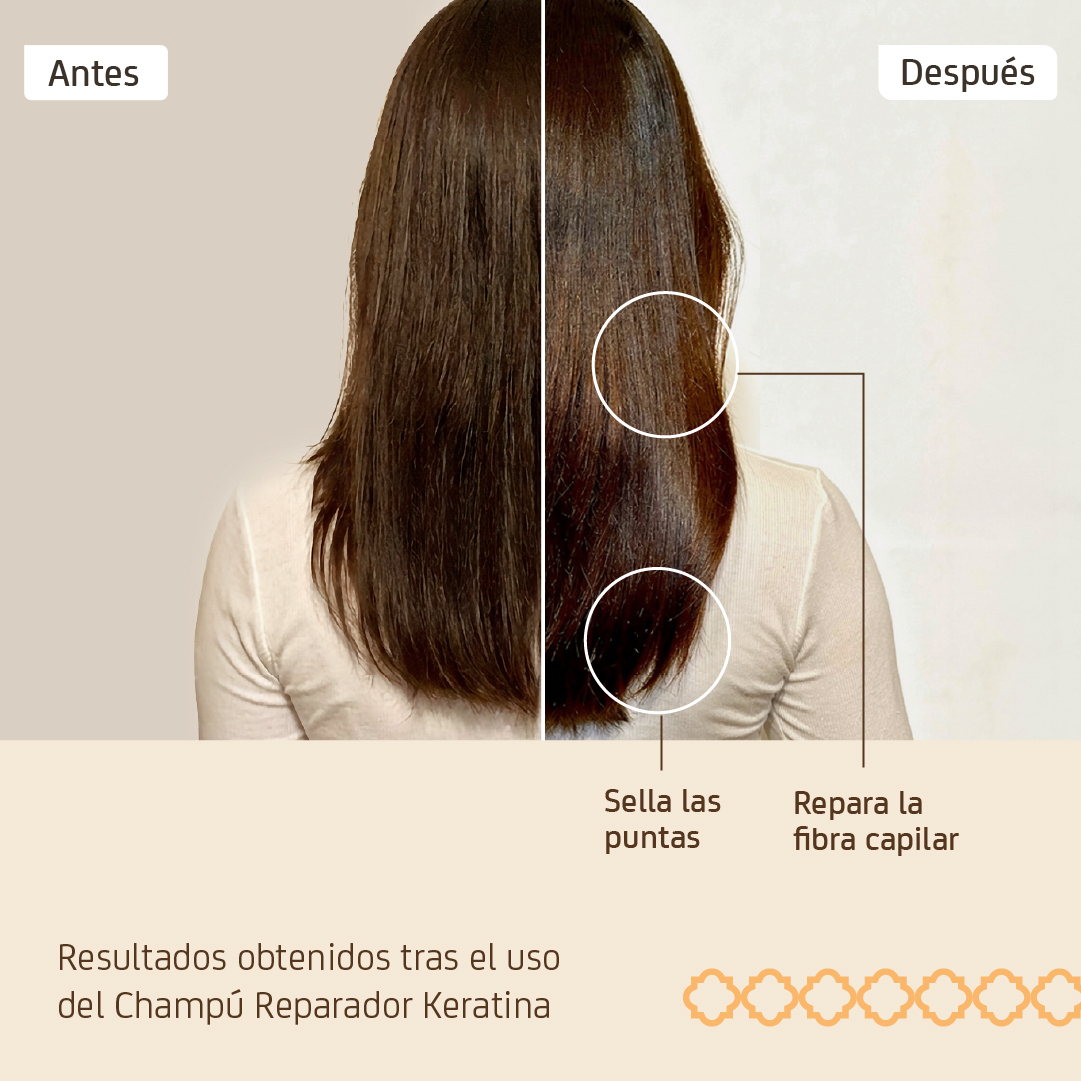 La Keratina + B5 rellena y reconstruye la fibra; el Colágeno une y compacta la keratina, y el Ácido Hialurónico hidrata, protege y sella el cabello. Todo esto hace que el cabello esté hidratado y tenga un aspecto sano.