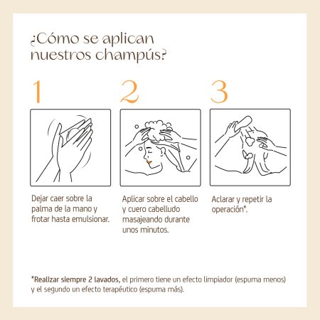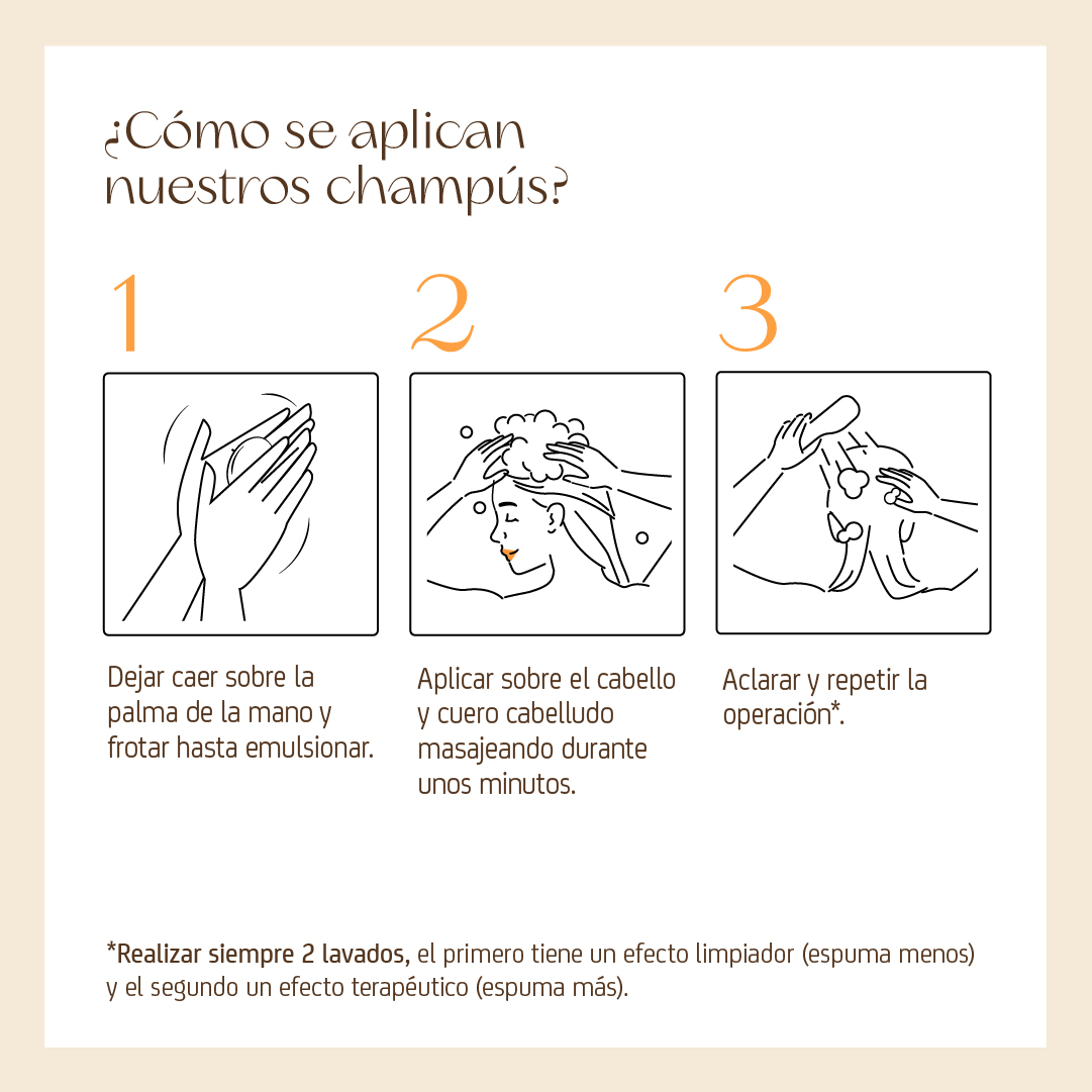 HACIÉNDOLO DE ESTA MANERA: Se preparan los activos en la palma de la mano. Se distribuye de manera uniforme los ingredientes activos por el cabello y cuero cabelludo. Se genera más espuma, facilitando el masaje capilar.