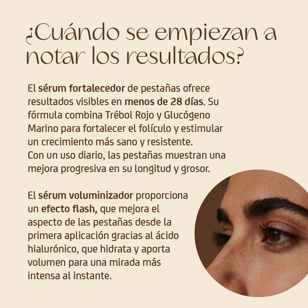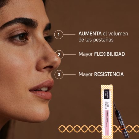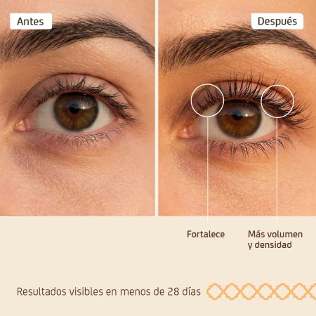 Primer tratamiento de pestañas con efecto frondosidad de doble acción: 1. Tratamiento para fortalecer las pestañas mejorando su densidad y fortaleza. 2. Efecto Flash que voluminiza las pestañas al instante. Los resultados son visibles en menos de 28 días. El uso diario y constante prolonga el ciclo de crecimiento de la pestaña, retrasa su fase de caída y fortalece además de oscurecer el pigmento del pelo.