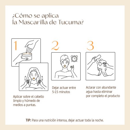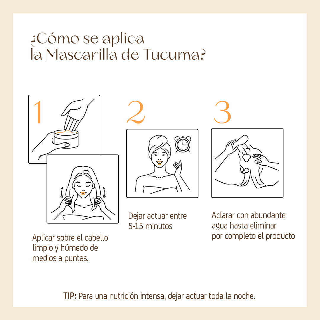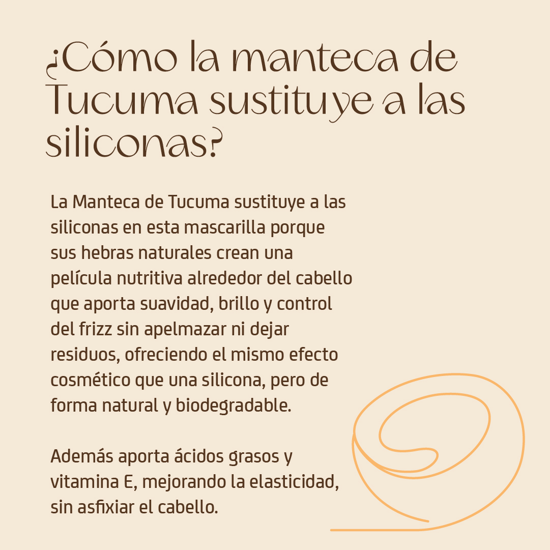 Gracias a las hebras naturales de la Manteca de Tucuma, envuelven el cabello en una capa nutritiva que suaviza, hidrata y repara intensamente. Una alternativa natural que reemplaza las siliconas tradicionales, dejando el cabello libre, ligero y saludable.