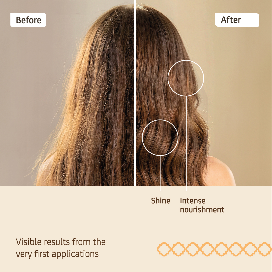 Usar uma noz de produto e aplicar do meio até às pontas. Massajar durante alguns minutos - Deixar atuar entre 5 a 15 minutos